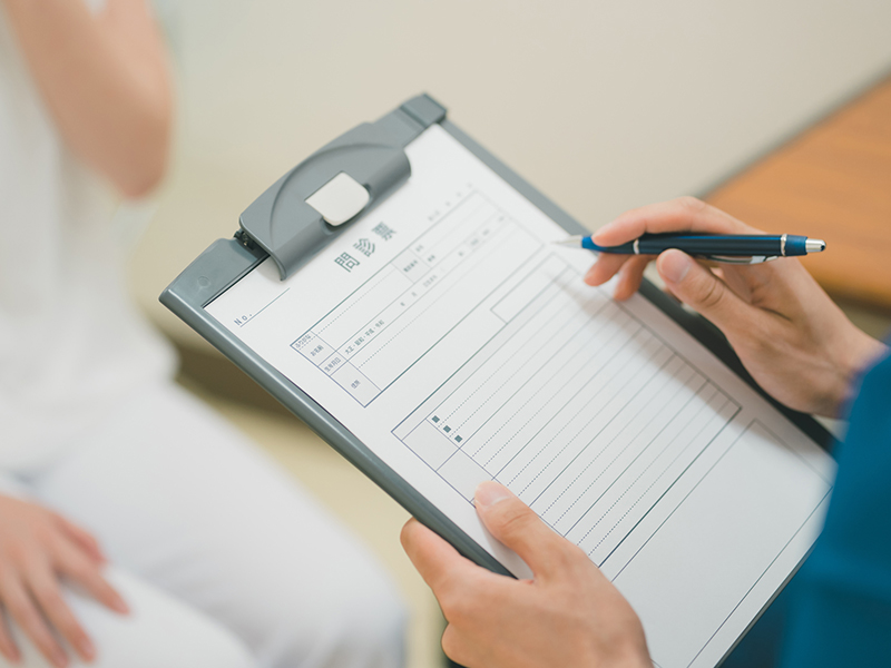 ご来院後、受付で保険証をお預かりし、症状や既往歴、服薬中の薬などを問診票にご記入いただきます。症状の経過や気になる点を詳しく書いていただくことで、医師が診察をスムーズかつ正確に行うことができます。